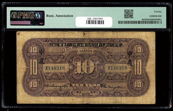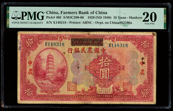 1182 imageChina, 1929 (ND 1940) 10 Yuan - Hankow, Farmers Bank Of China, S/M#C290-66, PMG 20 Very Fine (Pick-468), Rust, annotations. (Image1) (Image2) (All Images)