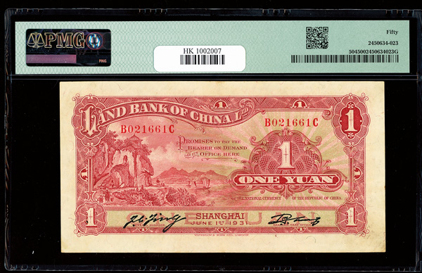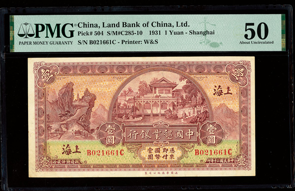 1191 imageChina, 1931 1 Yuan - Shanghai, Land Bank OF China, Ltd., S/M#C285-10, PMG 50 About Uncirculated (Pick-504) (Image1) (Image2) (All Images)