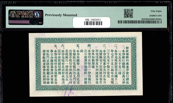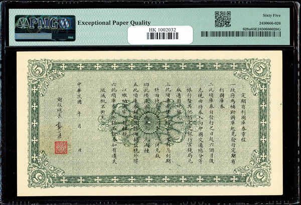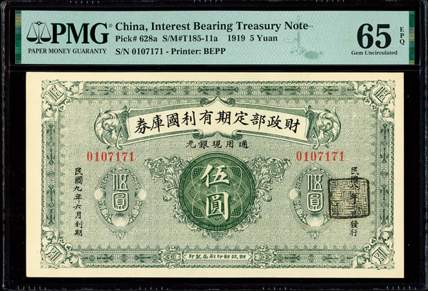 1200 imageChina, 1919 5 Yuan, Interest Bearing Treasury Note, S/M#T185-11a, PMG 65 Gem Uncirculated EPQ (Pick-628a) (Image1) (Image2) (All Images)