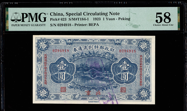 1199 imageChina, 1923 1 Yuan - Peking, Special Circulating Note, S/M#T184-1, PMG 58 Choice About Unc (Pick-623) (Image1) (Image2) (All Images)