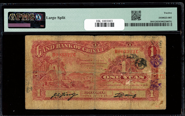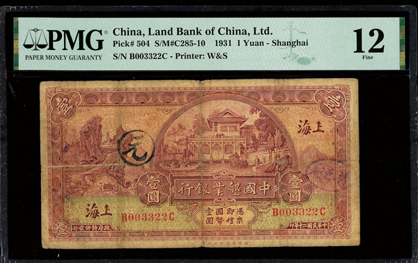 1192 imageChina, 1931 1 Yuan - Shanghai, Land Bank Of China Ltd., S/M#C285-10, PMG 12 Fine (Pick-504), large split. (Image1) (Image2) (All Images)