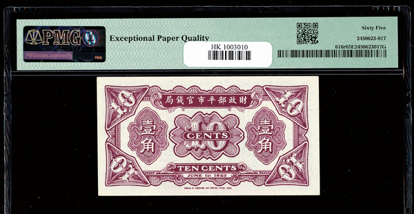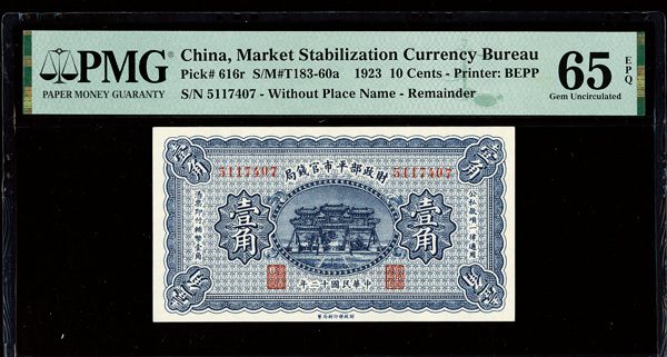 1197 imageChina, 1923 10 Cents - Printer: BEPP, Market Stabilization Currency Bureau, PMG 65 Gem Uncirculated EPQ (Pick-616r) (Image1) (Image2) (All Images)