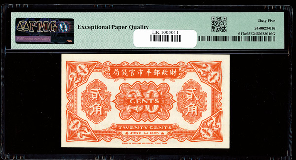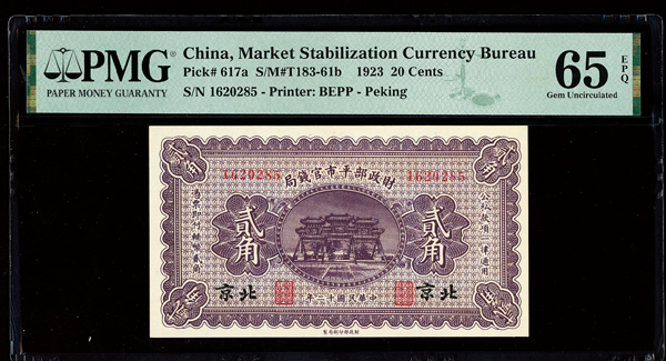 1198 imageChina, 1923 20 Cents, Market Stablization Currency Bureau, S/M#T183-61b, PMG 65 Gem Uncirculated EPQ (Pick-617a) (Image1) (Image2) (All Images)