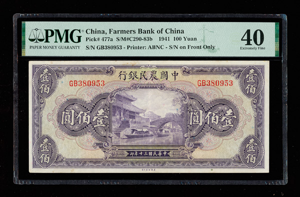 1190 imageChina, 1941 100 Yuan, Farmers Bank Of China, S/M#C290-83b, PMG 40 Extremely Fine (Pick-477a) (Image1) (Image2) (All Images)