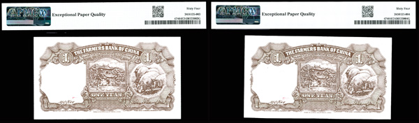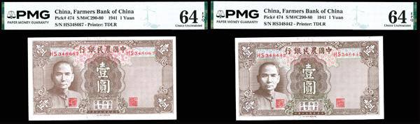 1185 imageGroup of (2) China, 1941 1 Yuan, Farmers Bank Of China, S/M#C290-80, PMG 64 Choice Uncirculated EPQ (Pick-474) (PDF for this Lot) (Image1) (Image2) (All Images)