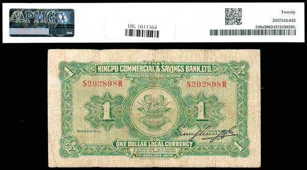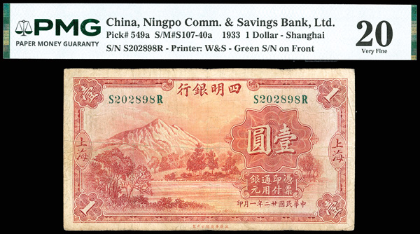 1193 imageChina, Ningpo, 1933 1 Dollar - Shanghai, Ningpo Comm. & Savings Bank Ltd., S/M#S107-40a, PMG 20 Very Fine (Pick-549a) (Image1) (Image2) (All Images)