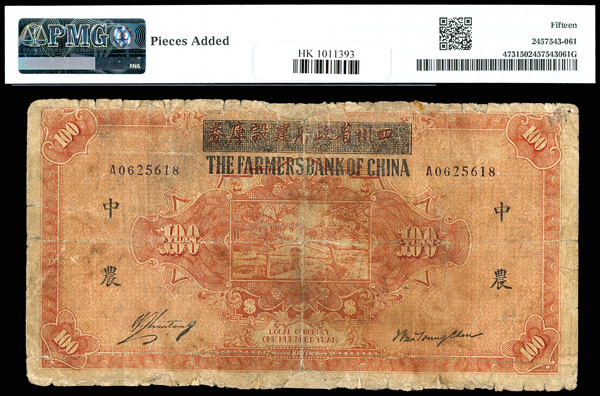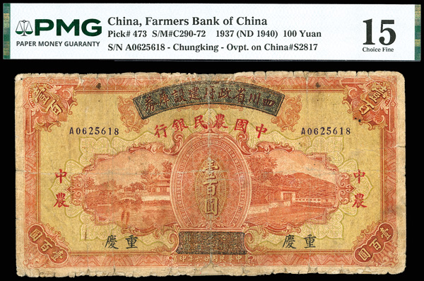 1184 imageChina, 1937 (ND 1940) 100 Yuan, Farmers Bank Of China, S/M#C290-72, PMG 15 Choice Fine (Pick-473), pieces added. (Image1) (Image2) (All Images)