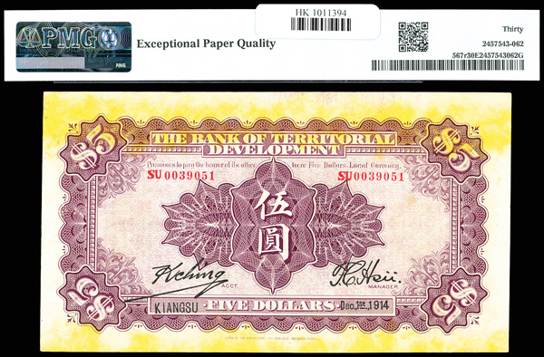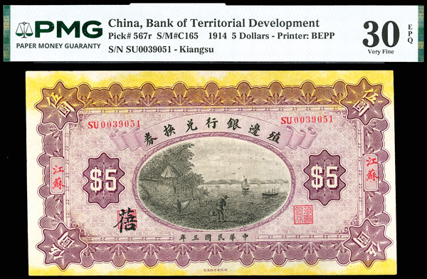 1195 imageChina, 1914 5 Dollars - Printer: BEPP, Bank Of Territorial Development, S/M#C165, PMG 30 Very Fine EPQ (Pick-567r) (Image1) (Image2) (All Images)
