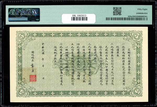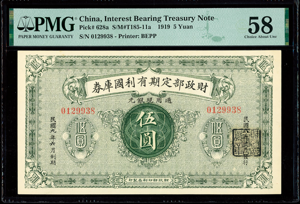 1202 imageChina, 1919 5 Yuan, Interest Bearing Treasury Note, S/M#T185-11a, PMG 58 Choice About Unc (Pick-628a) (Image1) (Image2) (All Images)