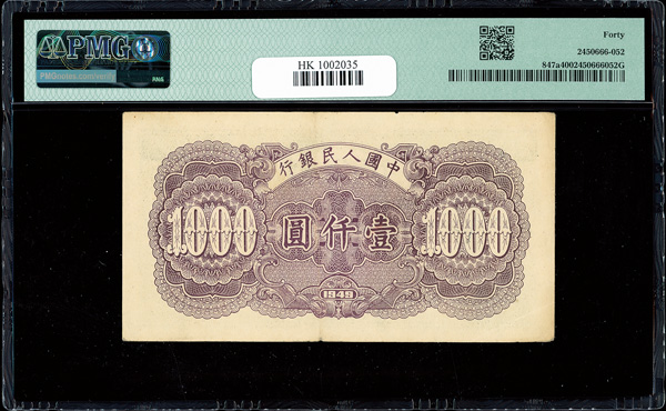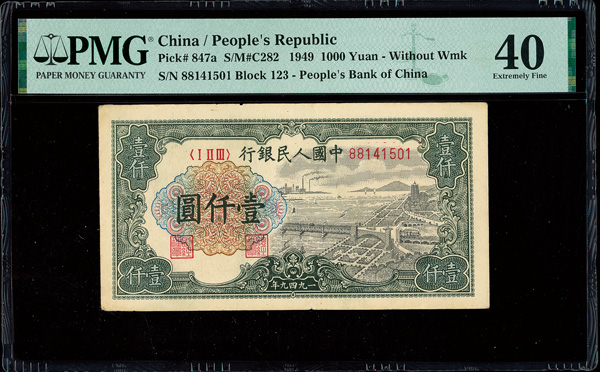 1218 imageChina, 1949 1000 Yuan - Without Wk, People's Republic, S/M#C282, PMG 40 Extremely Fine (Pick-847a) (Image1) (Image2) (All Images)