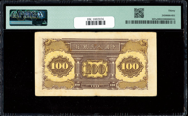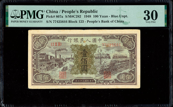 1205 imageChina, 1948 100 Yuan - Blue Unpt., People's Republic, S/M#C282, PMG 30 Very Fine (Pick-807a) (Image1) (Image2) (All Images)