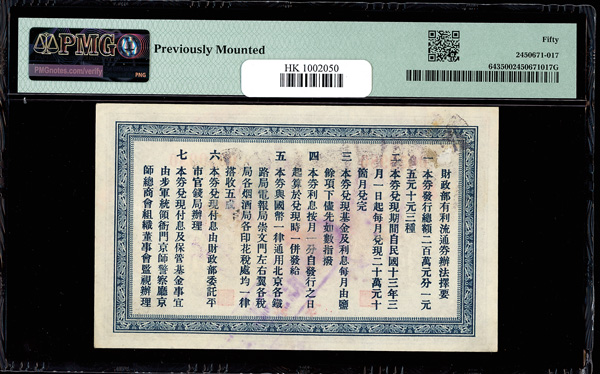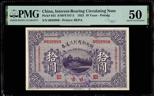 1203 imageChina, 1923 10 Yuan - Peking, Interest-Bearing Circulating Note, S/M#T187-3, PMG 50 About Uncirculated (Pick-643), previously mounted. (Image1) (Image2) (All Images)