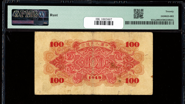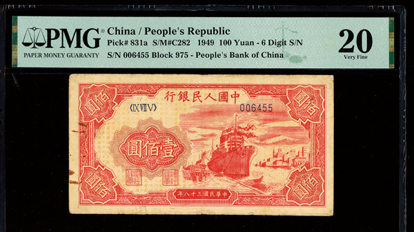 1209 imageChina, 1949 100 Yuan - 6 Digit S/N, People's Republic, S/M#C282, PMG 20 Very Fine (Pick-831a), rust. (Image1) (Image2) (All Images)