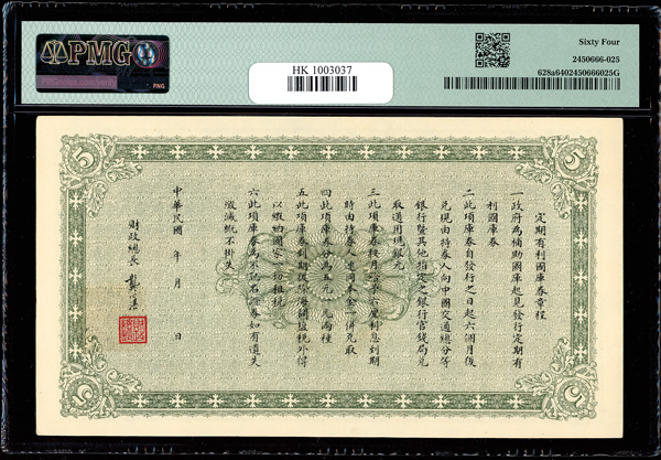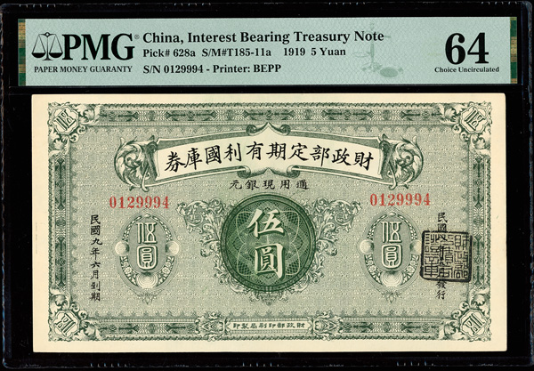 1201 imageChina, 1919 5 Yuan, Interest Bearing Treasury Note, S/M#T185-11a, PMG 64 Choice Uncirculated (Pick-628a) (Image1) (Image2) (All Images)