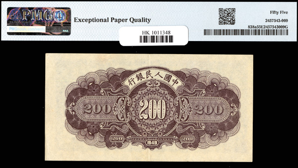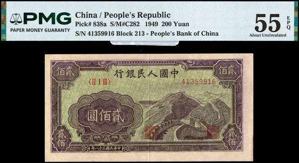 1213 imageChina, 1949 200 Yuan, People's Republic, S/M#C282, PMG 55 About Uncirculated EPQ (Pick-838a) (Image1) (Image2) (All Images)
