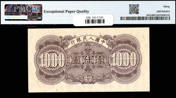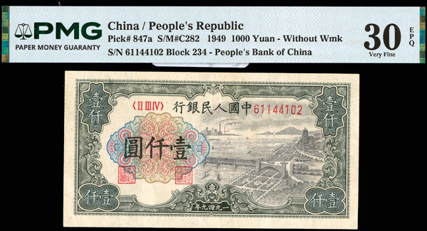 1219 imageChina, 1949 1000 Yuan - Without Wmk, People's Republic, S/M#C282, PMG 30 Very Fine EPQ (Pick-847a) (Image1) (Image2) (All Images)