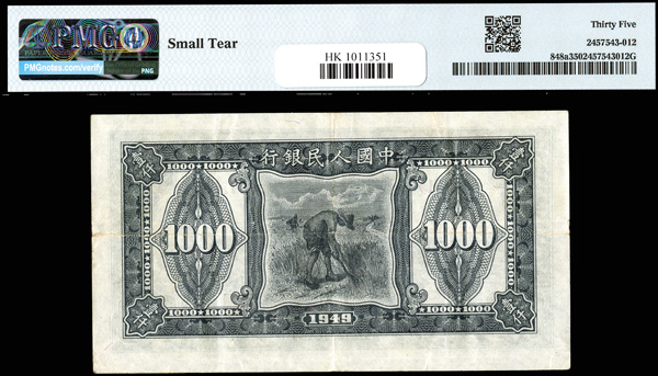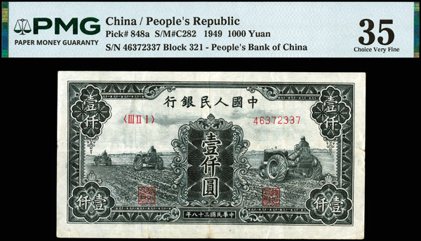 1220 imageChina, 1949 1000 Yuan, People's Republic, S/M#C282, PMG 35 Choice Very Fine (Pick-848a), small tear. (Image1) (Image2) (All Images)