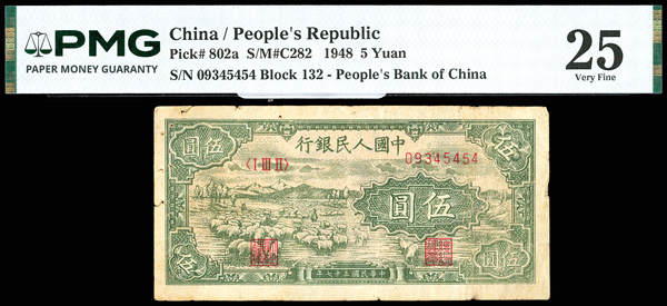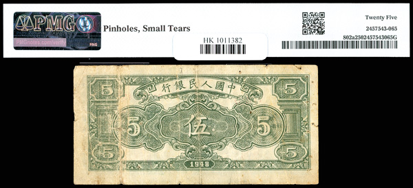 1204 imageChina, 1948 5 Yuan, People's Republic, S/M#C282, PMG 25 Very Fine (Pick-802a), pinholes, small tears. (Image1) (Image2) (All Images)