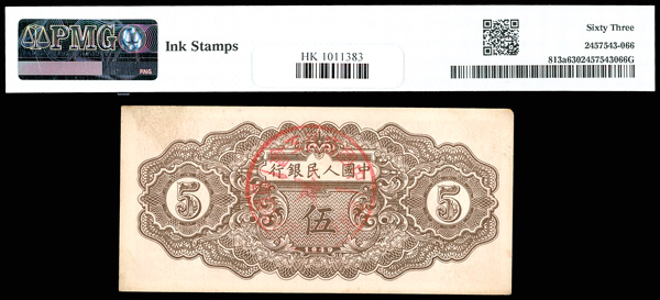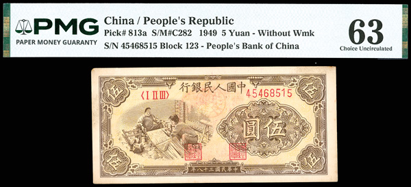1206 imageChina, 1949 5 Yuan - Without Wmk, People's Republic, S/M#C282, PMG 63 Choice Uncirculated (Pick-813a), ink stamps. (Image1) (Image2) (All Images)