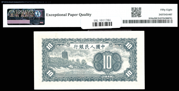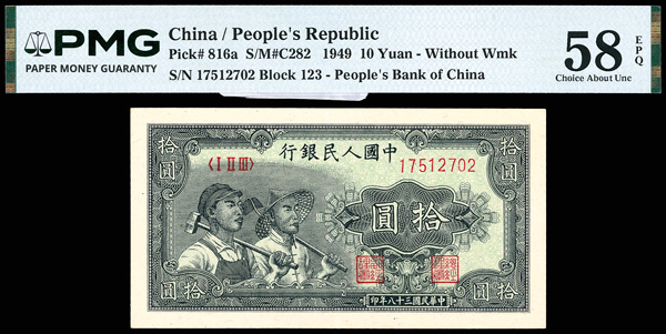 1207 imageChina, 1949 10 Yuan - Without Wmk, China / People's Republic, S/M#C282, PMG 58 Choice About Unc EPQ (Pick-816a) (Image1) (Image2) (All Images)