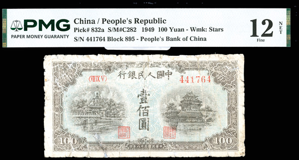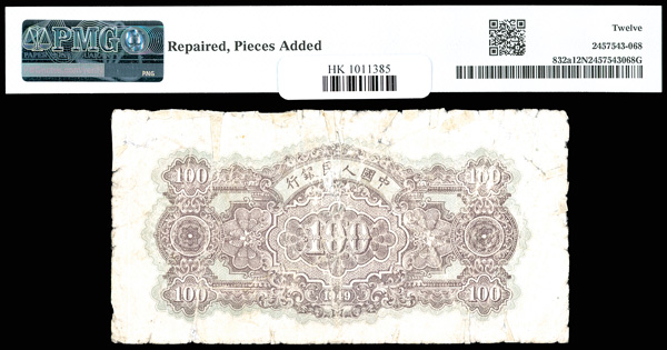 1211 imageChina, 1949 100 Yuan - Wmk: Stars, China / People's Republic, S/M#C282, PMG 12 Fine NET (Pick-832a), repaired; pieces added. (Image1) (Image2) (All Images)