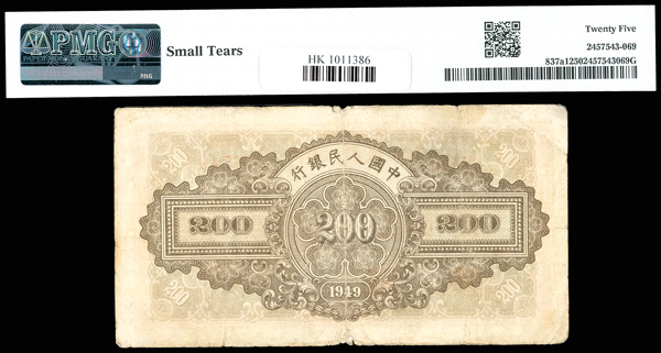 1212 imageChina, 1949 200 Yuan - Wmk: Triangles, China / People's Republic, S/M#C282, PMG 25 Very Fine (Pick-837a1), small tears. (Image1) (Image2) (All Images)