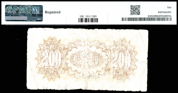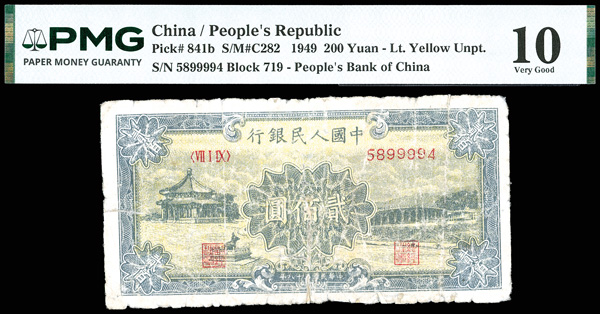 1215 imageChina, 1949 200 Yuan - Lt. Yellow Unpt., China / People's Republic, S/M#C282, PMG 10 Very Good (Pick-841b), repaired. (Image1) (Image2) (All Images)
