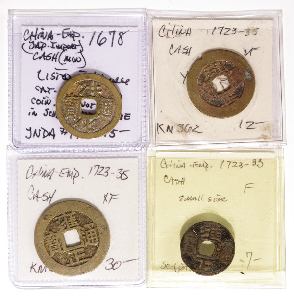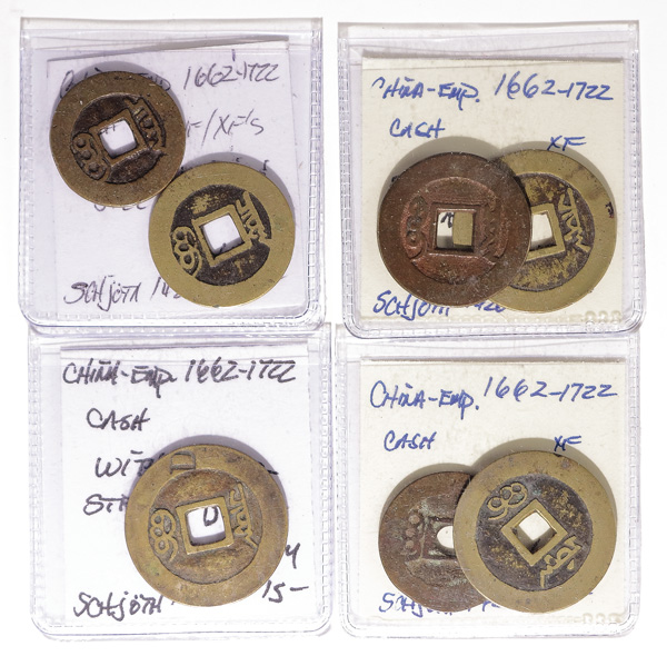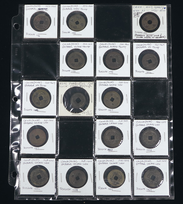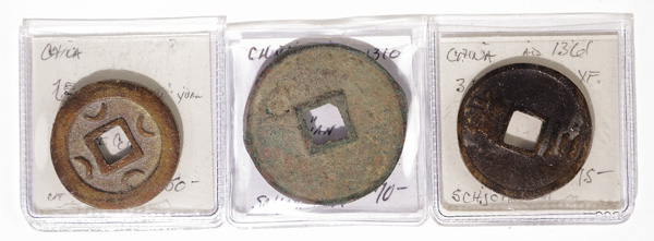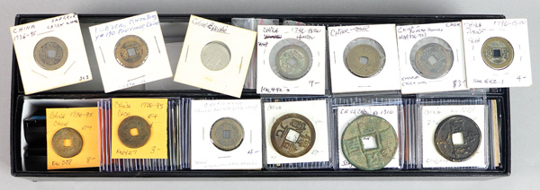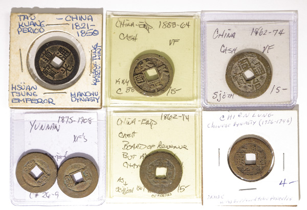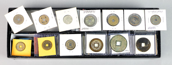 1010 imageChina, Collection of Cast Cash, Yuan to Qing Dynasty, includes 3 Cash, ca. 1361 (Schjoth 1131), Dayuan 10 Cash (1310-11; Schjoth 1099), others (5); various Qing Dynasty Cash (200+), large charm; also Republic and Provincial struck 10 Cash (4), a nickel piece and a charm/token, generally Fine-VF (214+). (Image1) (Image2) (Image3) (Image4) (Image5) (Image6) (Image7) (Image8) (All Images)