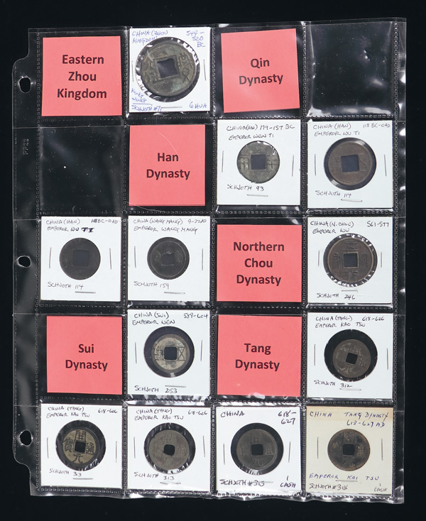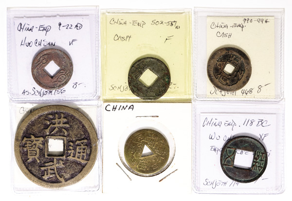 1011 imageChina, Eastern Zhou-Ming. Collection of Cash., Includes: Eastern Zhou. Pao liu huo, 33.5mm. Schjoth 71. Very Fine; other ancient types (6) -- ban liang, huo chuan etc; T'ang (7), Five Dynasties, Northern Song (57) including some multiple Cash, Southern Song (7), Liao (4), small Cash of the Yuan Dynasty, Ming (3). VG-Very Fine. (87). (Video for this lot) (Image1)