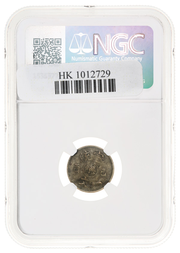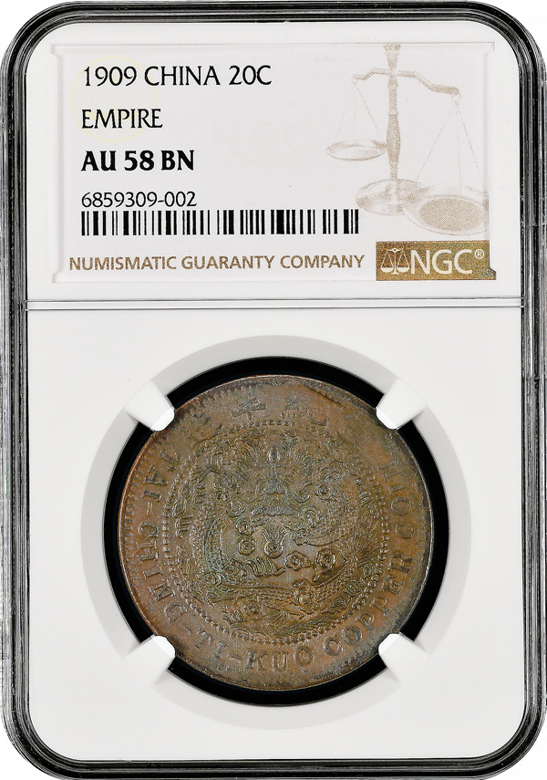 1013 imageChina: Empire, 20 Cash, CD (1909). Hsuan-t'ung (Xuantong [Puyi]). NGC Graded AU 58 BN. (Y-21). (Image1) (Image2) (All Images)