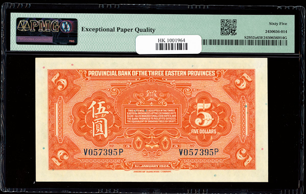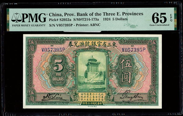 1339 imageChina, North East Provinces, 1924 5 Dollars, Prov. Bank Of The Three E. Provinces, S/M#T214-173a, PMG 65 Gem Uncirculated EPQ (Pick-S2952a) (Image1) (Image2) (All Images)