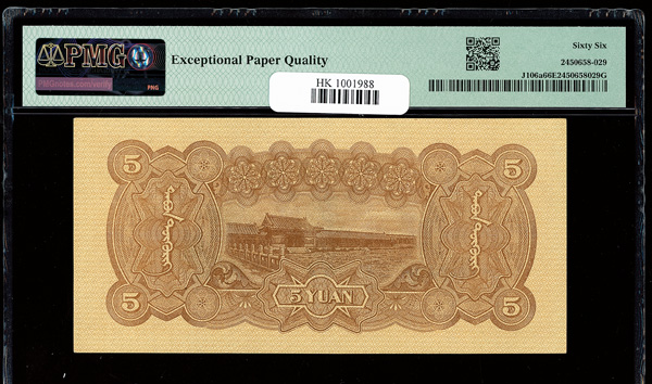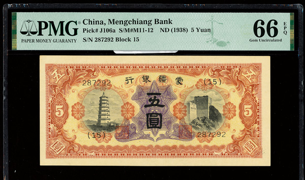 1337 imageMengkiang, ND (1938) 5 Yuan, Mengchiang Bank, S/M#M11-12 PMG 66 Gem Uncirculated EPQ (Pick-J106a) (Image1) (Image2) (All Images)