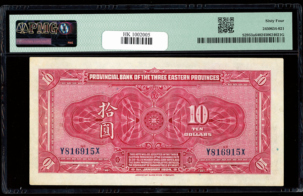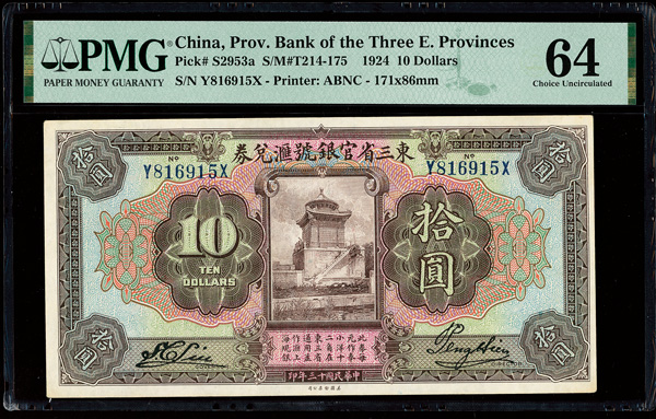 1340 imageChinese North East Provinces, 1924 10 Dollars, Prov. Bank Of The Three E. Provinces, S/M#T214-175, PMG 64 Choice Uncirculated (Pick-S2953a). (Image1) (Image2) (All Images)