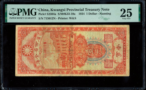 1333 imageKwangsi, 1934 1 Dollar - Nanning, Kwangsi Provincial Treasury Note, S/M#K33-10a, PMG 25 Very Fine (Pick-S2304a) (Image1) (Image2) (All Images)