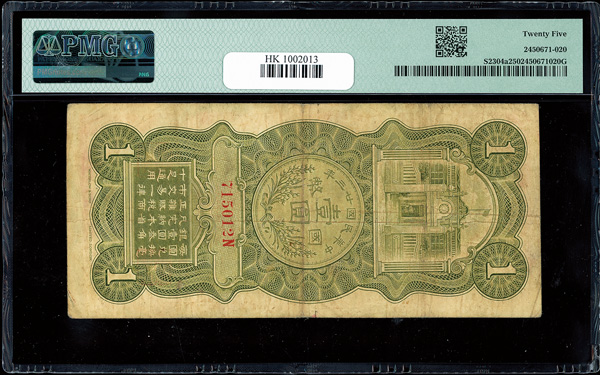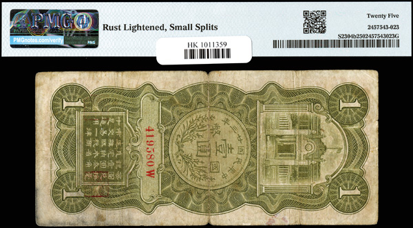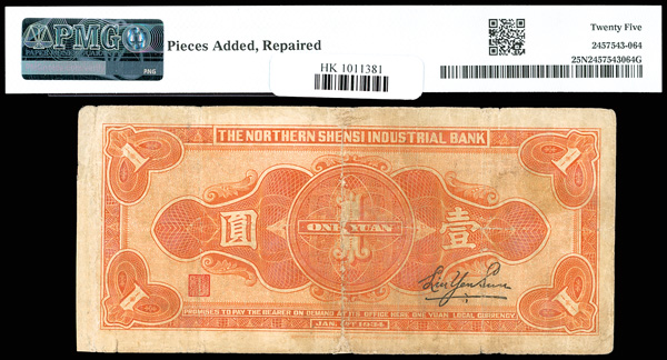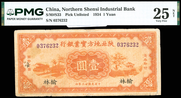 1345 imageShensi, 1934 1 Yuan, Northern Shensi Industrial Bank, S/M#S33, PMG 25 Very Fine NET (Pick-Unlisted) (Image1) (Image2) (All Images)