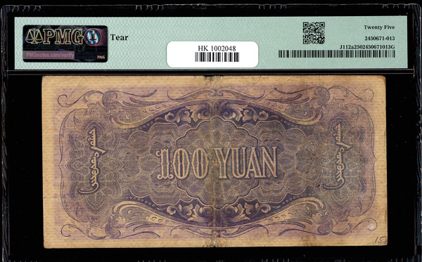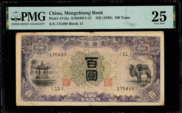 1338 imageMengkiang, ND (1938) 100 Yuan, Mengchiang Bank, S/M#M11-21, PMG 25 Very Fine (Pick-J112a), tear. (Image1) (Image2) (All Images)