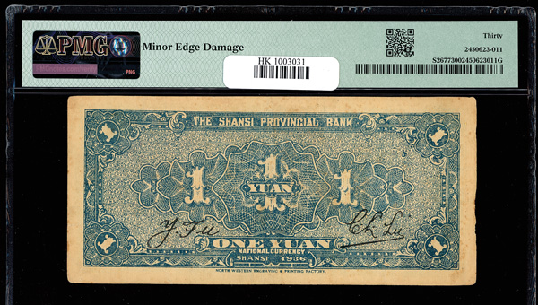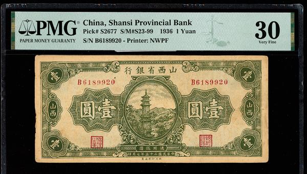 1343 imageShansi, 1936 1 Yuan, Shansi Provincial Bank, S/M#S23-99, PMG 30 Very Fine (Pick-S2677), minor edge damage. (Image1) (Image2) (All Images)