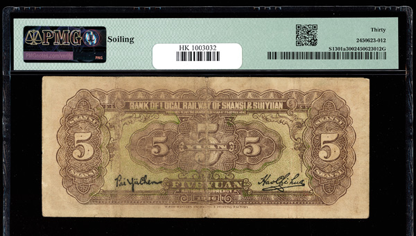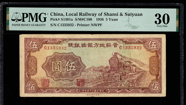 1342 imageShansi, 1936 5 Yuan, Local Railway Of Shansi & Suiyuan, S/M#C180, PMG 30 Very Fine (Pick-S1301a) (Image1) (Image2) (All Images)