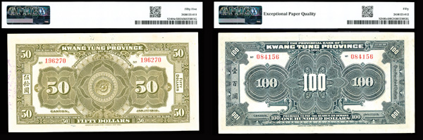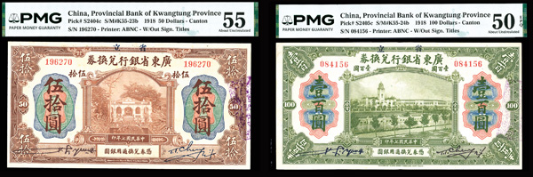 1336 imageGroup of (2) Kwangtung, 1918 50 Dollars & $100 Dollars, PMG Graded Banknotes, includes: Pick #2404c, 1918 50 Dollars - Canton, Provincial Bank Of Kwangtung Province, S/M#K55-23b, PMG 55 About Uncircualted & Pick #2405c, 1918 100 Dollars - Canton, Provincial Bank Of Kwangtung Province, S/M#K55-24b, PMG 50 About Uncirculated EPQ. (PDF for this Lot) (Image1) (Image2) (All Images)
