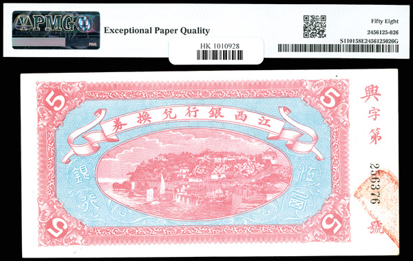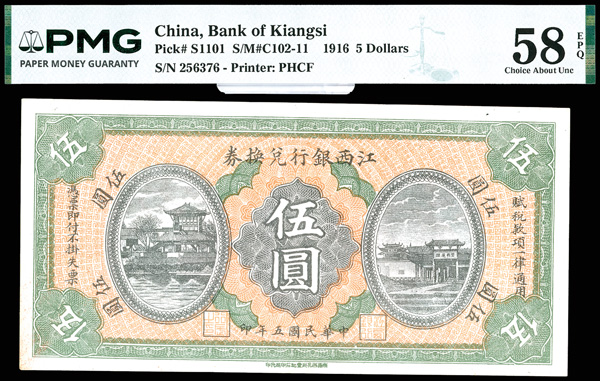 1331 imageKiangsi, 1916 5 Dollars, Bank Of Kiangsi, S/M#C102-11, PMG 58 Choice About Unc (Pick-S1101) (Image1) (Image2) (All Images)
