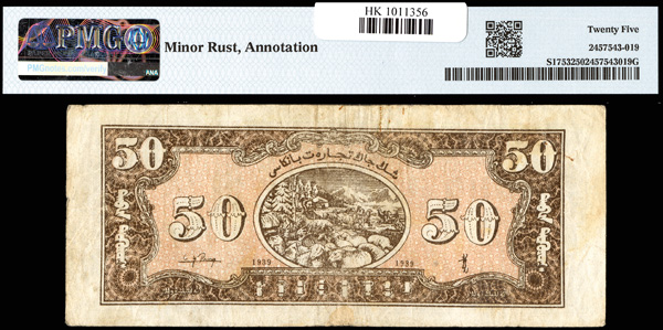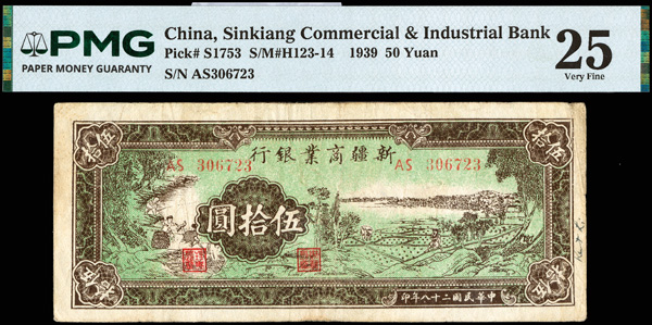 1346 imageSinkiang, 1939 50 Yuan, Sinkiang Commercial & Industrial Bank, S/M#H123-14, PMG 25 Very Fine (Pick-S1753), minor rust, annotation. (Image1) (Image2) (All Images)