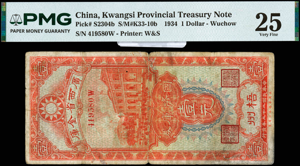 1334 imageKwangsi, 1934 1 Dollar - Wuchrow, Kwangsi Provincial Treasury Note, S/M#K33-10b, PMG 25 Very Fine (Pick-S2304b), rust lightened, small splits. (Image1) (Image2) (All Images)