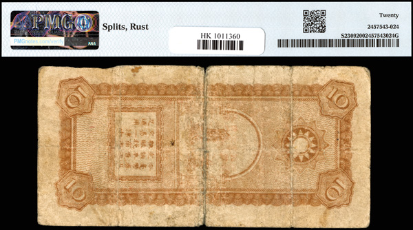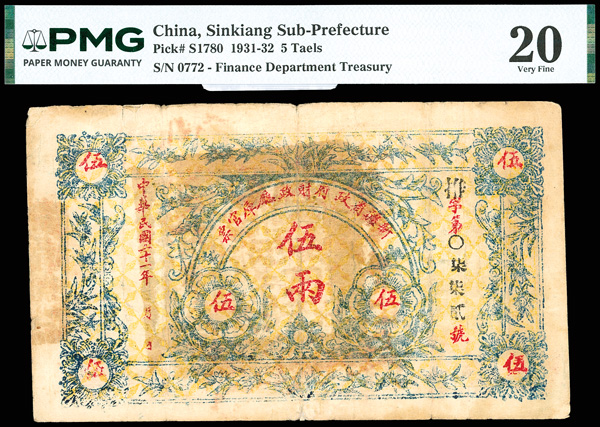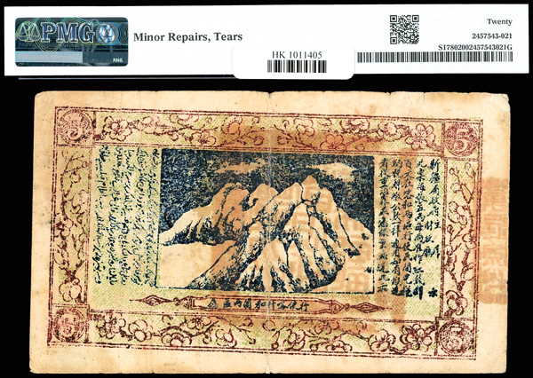 1348 imageSinkiang, 1931-32 5 Taels, Sinkiang Sub-Prefecture, PMG 20 Very Fine (Pick-S1780), minor repairs, tears. (Image1) (Image2) (All Images)