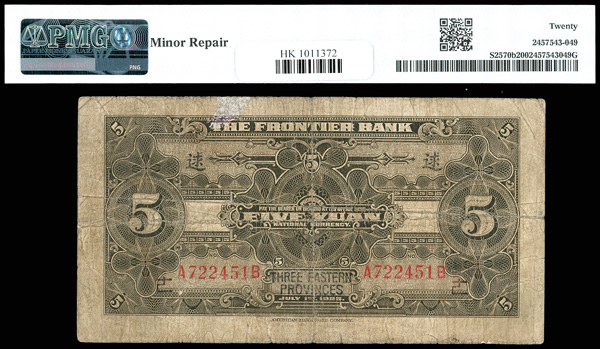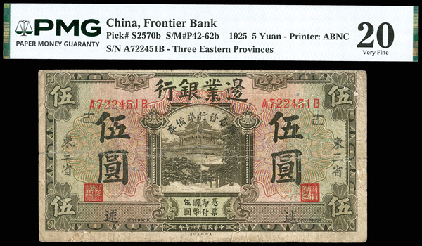 1341 imageChina, 1925 5 Yuan - Printer : ABNC, Frontier Bank, Three Eastern Provinces, S/M#P42-62b, PMG 20 Very Fine (Pick-S2570b), minor repair. (Image1) (Image2) (All Images)