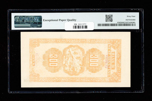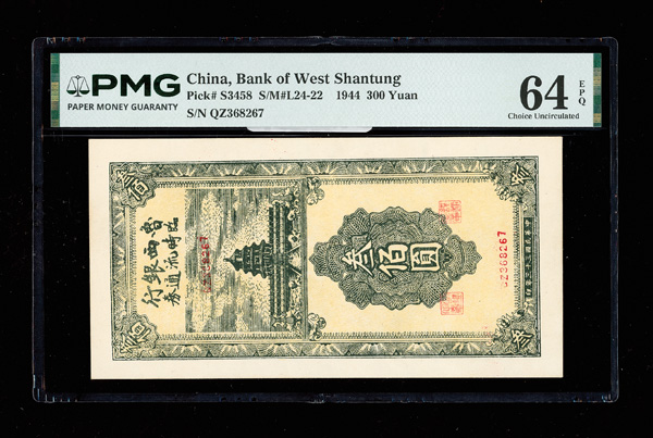 1344 imageShantung, 1944 300 Yuan, Bank Of West Shantung, S/M#L24-22, PMG 64 Choice Uncirculated EPQ (Pick-S3458), top of the pop; only 2 graded; extremely rare. (Image1) (Image2) (All Images)