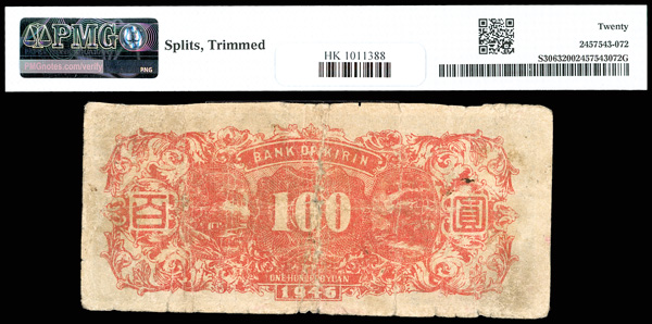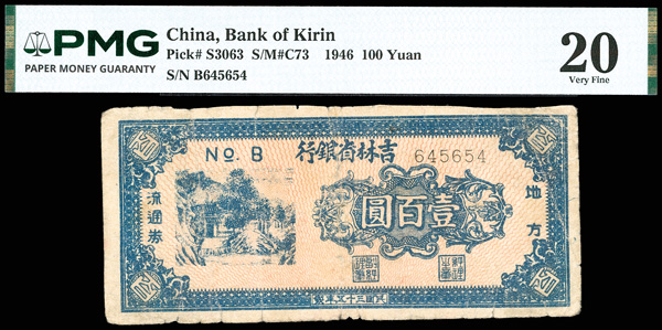 1332 imageKirin & Heilungkiang, 1946 100 Yuan, Bank Of Kirin, S/M#C73, PMG 20 Very Fine (Pick-S3063), splits, trimmed. (Image1) (Image2) (All Images)