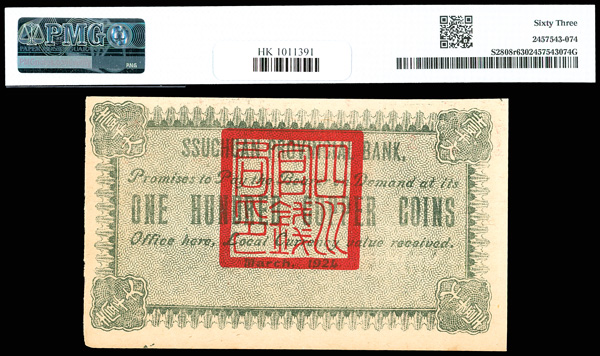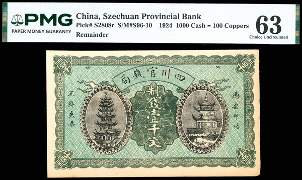 1349 imageSzechuan, 1924 1000 Cash = 100 Coppers, Szechuan Provincial Bank, S/M#S96-10, PMG 63 Choice Uncirculated (Pick-S2808r) (Image1) (Image2) (All Images)