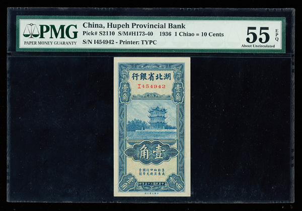 1330 imageHupeh, 1936 1 Chiao = 10 Cents, Hupeh Provincial Bank, S/M#H173-40, PMG 55 About Uncirculated EPQ (Pick-S2110) (Image1) (Image2) (All Images)
