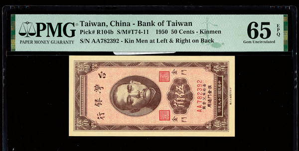 1375 imageTaiwan, 1950 50 Cents - Kinmen, Bank Of Taiwan, S/M#T74-11, PMG 65 Gem Uncirculated EPQ (Pick-R104b) (Image1) (Image2) (All Images)