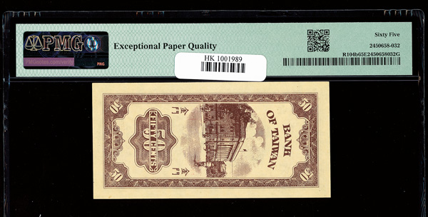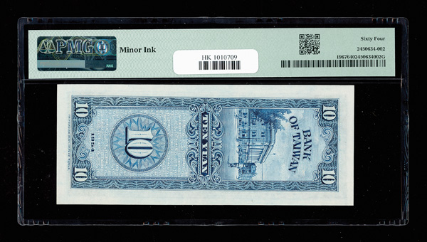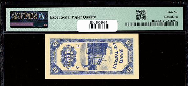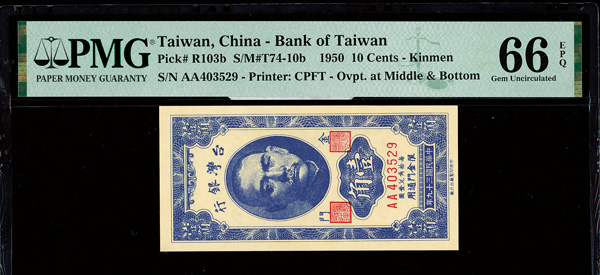 1374 imageTaiwan, 1950 10 Cents - Kinmen, Bank Of Taiwan, S/M#T74-10b, PMG 66 Gem Uncirculated EPQ (Pick-R103b) (Image1) (Image2) (All Images)
